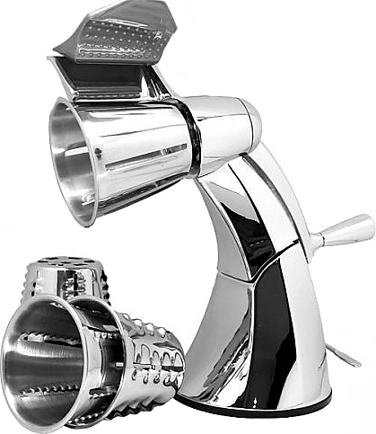 В комплект поставки входят 5 насадок: шредер, мелкая и крупная ломтерезки, терка для картофеля фри и вафельная насадка.
