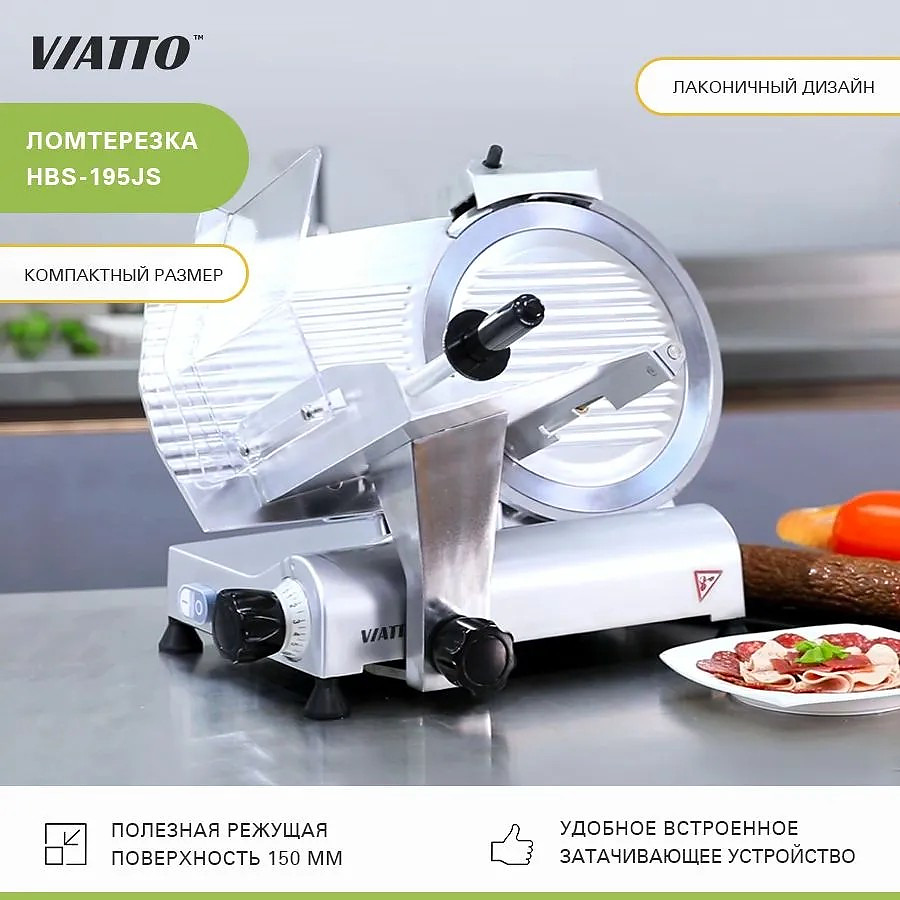Слайсер VIATTO HBS-195JS предназначен для нарезки равными ломтиками приготовленного мяса, колбасных изделий, сыра и овощей на предприятиях общественного питания, торговли и пищевых производствах. Модель оснащена затачивающим устройством, прикрепленным на каретку. Материал корпуса - алюминиевый сплав.
