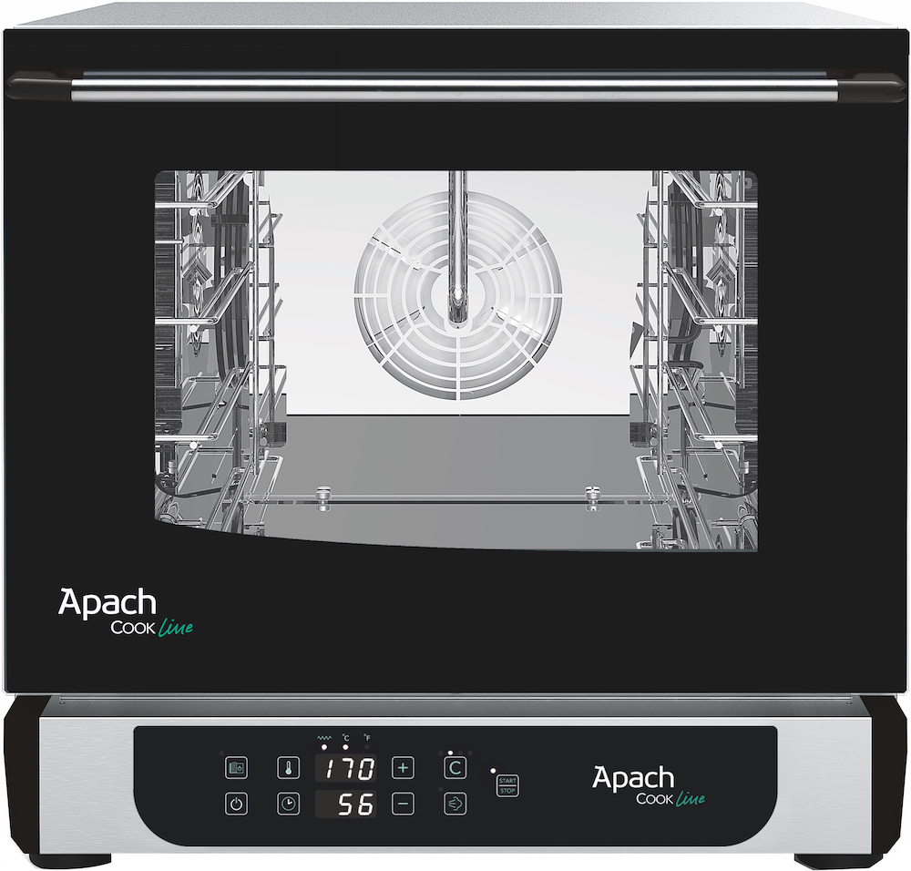 Конвекционная печь Apach AD44D предназначена для выпекания или разогрева кондитерских и хлебобулочных изделий, готовых блюд, замороженных или предварительно выдержанных в расстоечном шкафу заготовок из теста на предприятиях общественного питания и торговли. Подсветка камеры осуществляется галогеновой лампой. Камера легко чистится благодаря закругленным углам. Корпус выполнен из нержавеющей стали, дверца - из двойного закаленного стекла.