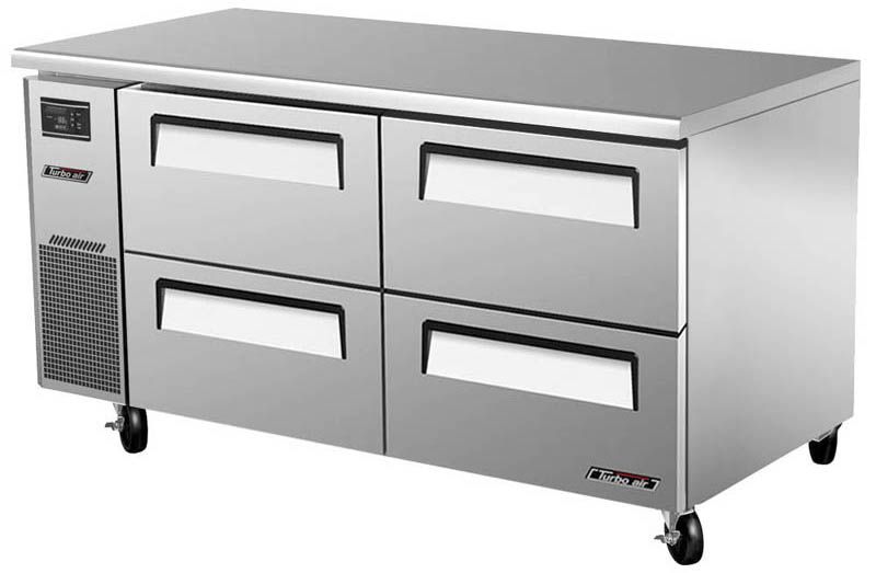 Холодильный стол Turbo air KUR15-2D-4 предназначен для раскатки теста, обработки, охлаждения и кратковременного хранения продуктов и напитков на предприятиях общественного питания и торговли. Корпус выполнен из нержавеющей стали (гальванизированная сталь на оборотной стороне и внизу) с применением пожаробезопасных стенок толщиной 60 мм, уплотнения - из АБС-пластика (акрилонитрилбутадиенстирола), не пропускающего конденсата, пол - из нержавеющей стали с алюминиевыми вставками по бокам и сзади оборудования, тройные направляющие - из высококачественной нержавеющей стали.