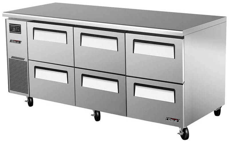 Холодильный стол Turbo air KUR18-2D-6 предназначен для раскатки теста, обработки, охлаждения и кратковременного хранения продуктов и напитков на предприятиях общественного питания и торговли. Корпус выполнен из нержавеющей стали (гальванизированная сталь на оборотной стороне и внизу) с применением пожаробезопасных стенок толщиной 60 мм, уплотнения - из АБС-пластика (акрилонитрилбутадиенстирола), не пропускающего конденсата, пол - из нержавеющей стали с алюминиевыми вставками по бокам и сзади оборудования, тройные направляющие - из высококачественной нержавеющей стали.