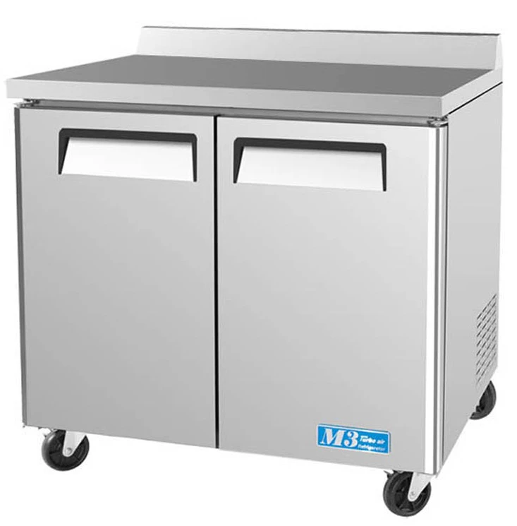 Холодильный стол Turbo air CMWR-36L используется на предприятиях общественного питания, торговли и пищевых производствах для обработки, охлаждения и кратковременного хранения продуктов, а также для раскатки теста. Стол оснащен динамической системой охлаждения, аналоговым управлением и установлен на 4 колеса (2 фронтальные со стопорами). Материал корпуса - нержавеющая сталь, материал задней стенки и пола - гальванизированная сталь, материал пола - нержавеющая сталь с алюминиевыми вставками, материал регулируемых полок - толстая стальная проволока с виниловым покрытием.
