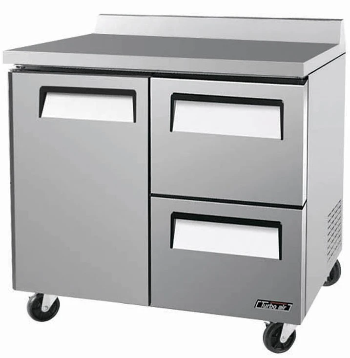 Холодильный стол Turbo air CMWR-36-2D-2 используется на предприятиях общественного питания, торговли и пищевых производствах для обработки, охлаждения и кратковременного хранения продуктов, а также для раскатки теста. Стол оснащен динамической системой охлаждения, аналоговым управлением и установлен на 4 колеса (2 фронтальные со стопорами). Материал корпуса и направляющих - нержавеющая сталь, материал задней стенки и пола - гальванизированная сталь, материал пола - нержавеющая сталь с алюминиевыми вставками, материал регулируемых полок - толстая стальная проволока с виниловым покрытием.