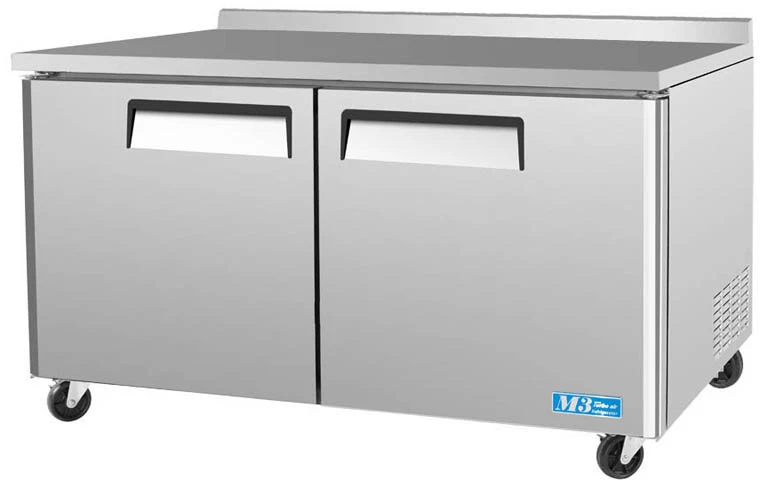 Холодильный стол Turbo air CMWR-60 используется на предприятиях общественного питания, торговли и пищевых производствах для обработки, охлаждения и кратковременного хранения продуктов, а также для раскатки теста. Стол оснащен динамической системой охлаждения, аналоговым управлением и установлен на 4 колеса (2 фронтальные со стопорами). Материал корпуса - нержавеющая сталь, материал задней стенки и пола - гальванизированная сталь, материал пола - нержавеющая сталь с алюминиевыми вставками, материал регулируемых полок - толстая стальная проволока с виниловым покрытием.