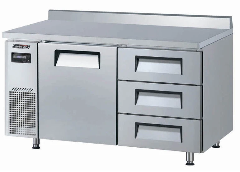 Холодильный стол Turbo air KWR15-3D-3-700 используется для охлаждения, заморозки и длительного хранения пищевых продуктов, а также для обработки ингредиентов на предприятиях общественного питания, торговли и пищевых производствах. Динамическая система охлаждения. Стол установлен на 4 колесах, оснащен дверью и 3 ящиками. Материал корпуса, ножек и направляющих - нержавеющая сталь, материал задней и нижней панелей - гальванизированная сталь, материал пола - нержавеющая сталь с алюминиевыми вставками, материал полок - толстая стальная проволока с виниловым покрытием, материал уплотнения - ABS-пластик.