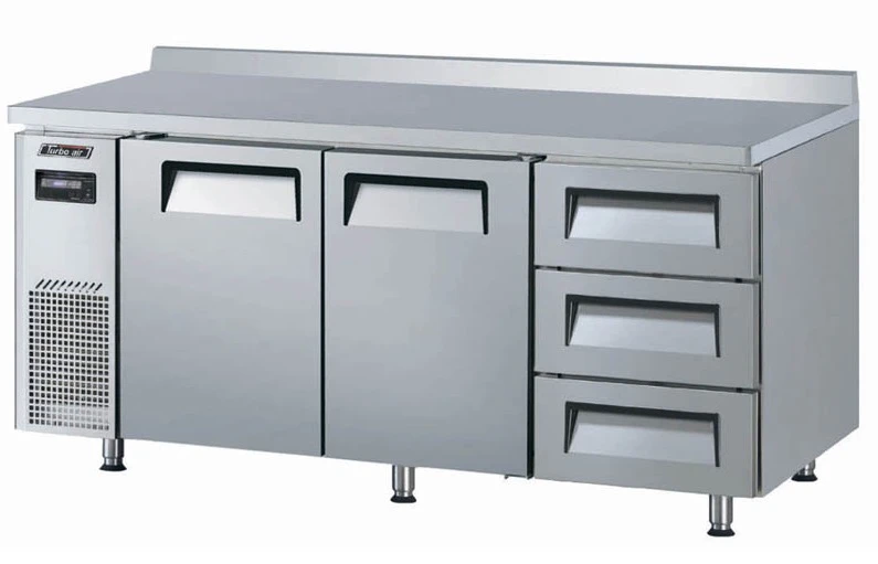 Холодильный стол Turbo air KWR18-3D-3-750 используется для охлаждения, заморозки и длительного хранения пищевых продуктов, а также для обработки ингредиентов на предприятиях общественного питания, торговли и пищевых производствах. Динамическая система охлаждения. Стол установлен на 6 колесах, оснащен 2 дверями, 2 полками и 3 ящиками. Материал корпуса и направляющих - нержавеющая сталь, материал задней и нижней панелей - гальванизированная сталь, материал пола - нержавеющая сталь с алюминиевыми вставками, материал полок - толстая стальная проволока с виниловым покрытием, материал уплотнения - ABS-пластик.