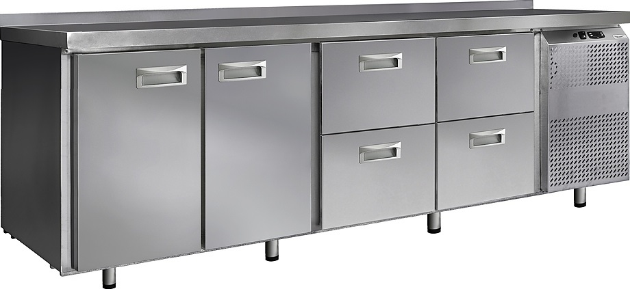 Холодильный стол Finist СХС-700-2/4 используется на предприятиях общественного питания, торговли и пищевых производствах для хранения и обработки полуфабрикатов из мяса и рыбы, заготовок для салата, охлажденных напитков и прочих пищевых продуктов. Управление при помощи кнопочной панели управления, оснащенной цифровым дисплеем. 2 холодильные камеры с распашными дверцами, 4 выдвижных ящика, агрегатный отсек располагается сбоку. Стол установлен на ножки с подпятниками. Материал корпуса - нержавеющая сталь.