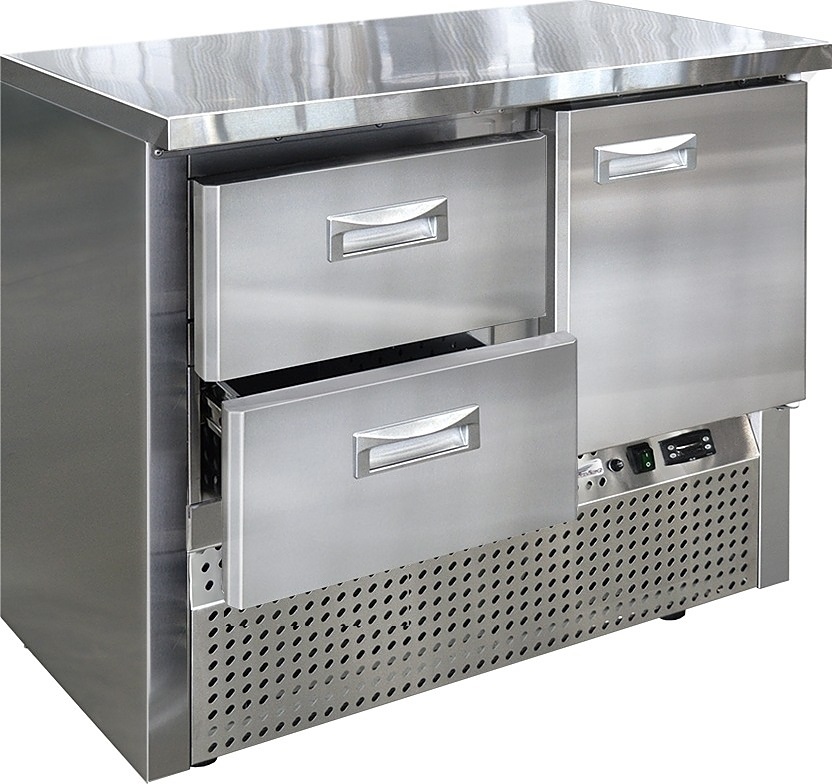 Холодильный стол Finist СХСн-700-1/2 используется на предприятиях общественного питания, торговли и пищевых производствах для хранения и обработки полуфабрикатов из мяса и рыбы, заготовок для салата, охлажденных напитков и прочих пищевых продуктов. Управление при помощи кнопочной панели управления, оснащенной цифровым дисплеем. Камеры с распашными дверцами, 2 выдвижных ящика, агрегатный отсек располагается снизу. Стол установлен на ножки с подпятниками. Материал корпуса - нержавеющая сталь.