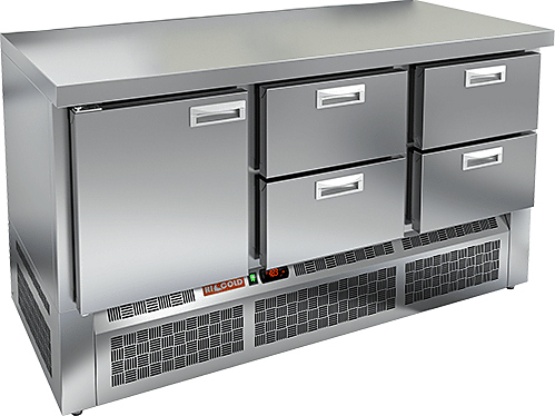 Холодильный стол HICOLD GNE 122/TN O используется на предприятиях общественного питания, торговли и пищевых производствах для обработки различных ингредиентов и хранения продуктов, напитков и кухонных принадлежностей. Модель оснащена электронной панелью управления, динамической системой охлаждения, автоматической оттайкой, доводчиком дверей с фиксатором, глухой дверцей, ящиками и регулируемыми ножками. Материал корпуса и столешницы - высококачественная нержавеющая сталь.