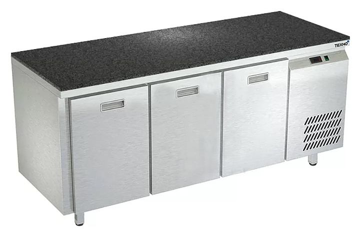 Холодильный стол Техно-ТТ СПБ/О-323/03-1807 предназначается для раскатки теста, обработки, охлаждения и кратковременного хранения продуктов и напитков на предприятиях общественного питания, торговли и пищевых производствах. Секции оснащены направляющими и ящиками с доводчиками. Материал корпуса - нержавеющая сталь AISI 430, материал столешницы - гранит (толщина 20 мм), материал задней панели и дна - оцинкованная сталь.