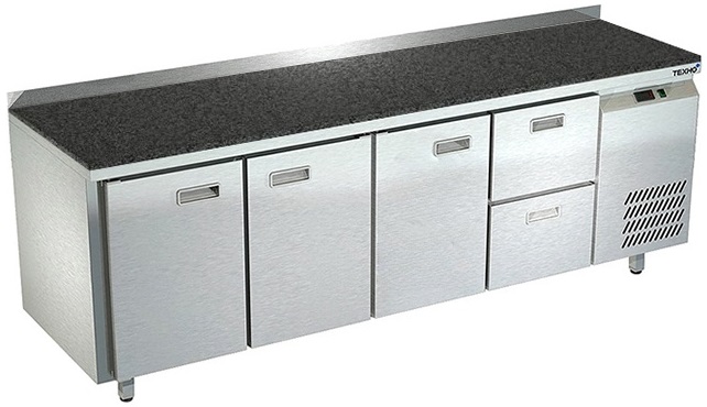 Холодильный стол Техно-ТТ СПБ/О-422/32-2207 предназначается для раскатки теста, обработки, охлаждения и кратковременного хранения продуктов и напитков на предприятиях общественного питания, торговли и пищевых производствах. Секции оснащены направляющими и ящиками с доводчиками. Материал корпуса - нержавеющая сталь AISI 430, материал столешницы - гранит (толщина 20 мм), материал задней панели и дна - оцинкованная сталь.