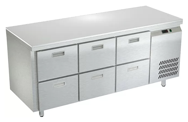 Холодильный стол Техно-ТТ СПБ/О-523/06-1807 предназначается для раскатки теста, обработки, охлаждения и кратковременного хранения продуктов и напитков на предприятиях общественного питания, торговли и пищевых производствах. Секции оснащены направляющими и ящиками с доводчиками. Материал корпуса - нержавеющая сталь AISI 430, материал столешницы - полипропилен, материал задней панели и дна - оцинкованная сталь.