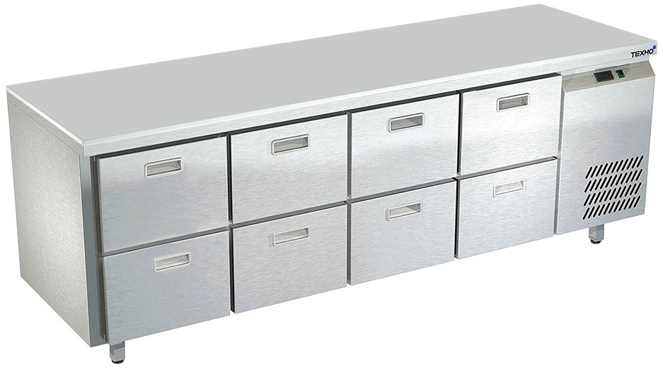 Холодильный стол Техно-ТТ СПБ/О-523/08-2207 предназначается для раскатки теста, обработки, охлаждения и кратковременного хранения продуктов и напитков на предприятиях общественного питания, торговли и пищевых производствах. Секции оснащены направляющими и ящиками с доводчиками. Материал корпуса - нержавеющая сталь AISI 430, материал столешницы - полипропилен, материал задней панели и дна - оцинкованная сталь.
