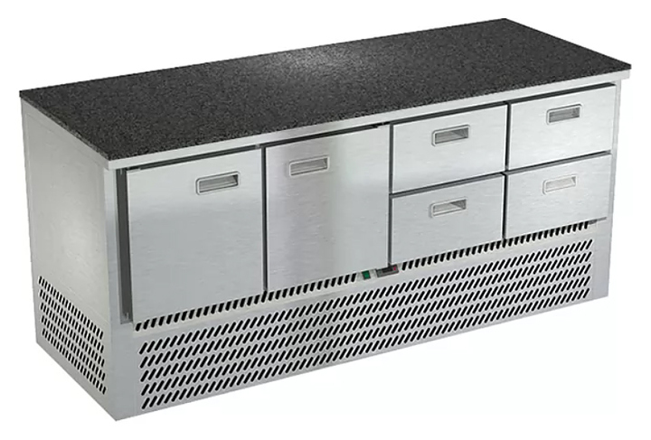 Холодильный стол Техно-ТТ СПН/О-322/24-1906 предназначается для раскатки теста, обработки, охлаждения и кратковременного хранения продуктов и напитков на предприятиях общественного питания, торговли и пищевых производствах. Секции оснащены направляющими и ящиками с доводчиками. Материал корпуса - нержавеющая сталь AISI 430, материал столешницы - гранит (толщина 20 мм), материал задней панели и дна - оцинкованная сталь.