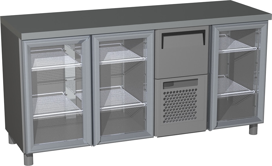 Холодильный стол Carboma T57 M3-1-G 9006-1(2)9 (BAR-360С) предназначен для размещения кофемашин и охлаждения и хранения молока и кофейных зерен на предприятиях общественного питания и торговли. Модель оснащена 6 полками, охлаждаемым ящиком под агрегатом, планкой под выбивание холдера и регулируемыми ножками высотой от 90 до 110 мм. Цельнозаливной корпус выполнен из черной крашеной стали, столешница - из нержавеющей стали, дверцы - из стекла.