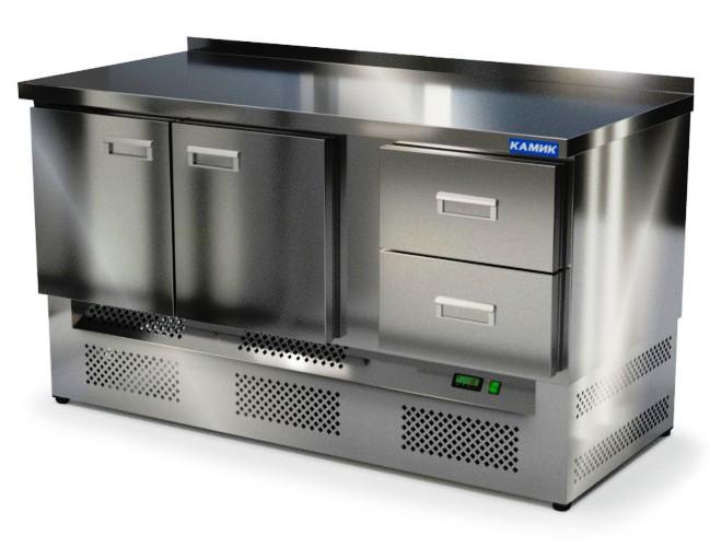 Холодильный стол КАМИК-СО22157Н используется на предприятиях общественного питания и торговли для охлаждения и хранения продуктов, напитков и готовых блюд. Конструкция разделена на секции, каждая из которых оборудована сетчатой полкой и парой направляющих. Корпус выполнен из нержавеющей стали AISI 430 толщиной 1 мм, столешница - из нержавеющей стали AISI 304 толщиной 1,5 мм.