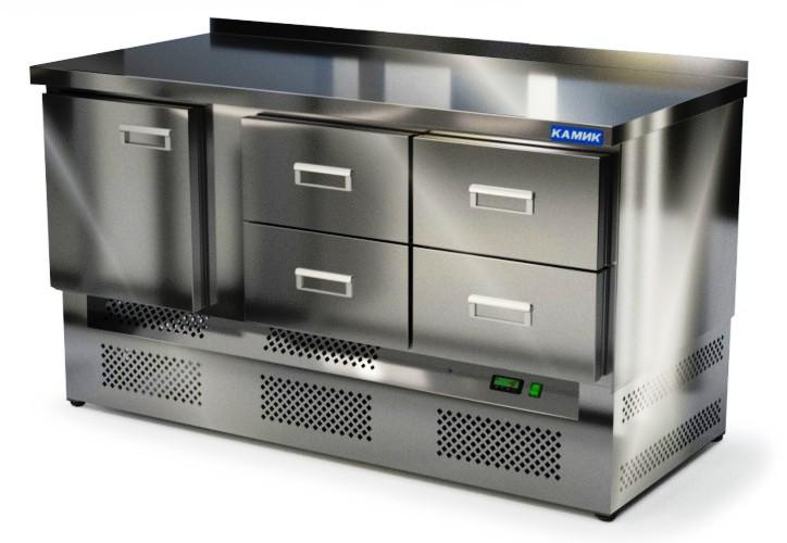 Холодильный стол КАМИК СО-14157Н используется на предприятиях общественного питания и торговли для охлаждения и хранения продуктов, напитков и готовых блюд. Конструкция разделена на секции, каждая из которых оборудована сетчатой полкой и парой направляющих. Корпус выполнен из нержавеющей стали AISI 430 толщиной 1 мм, столешница - из нержавеющей стали AISI 304 толщиной 1,5 мм.