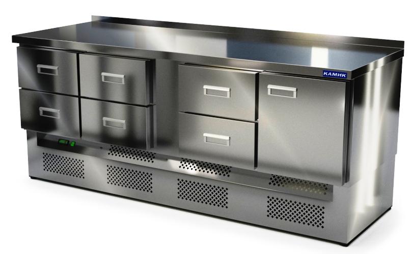 Холодильный стол КАМИК СО-16206Н используется на предприятиях общественного питания и торговли для охлаждения и хранения продуктов, напитков и готовых блюд. Конструкция разделена на секции, каждая из которых оборудована сетчатой полкой и парой направляющих. Корпус выполнен из нержавеющей стали AISI 430 толщиной 1 мм, столешница - из нержавеющей стали AISI 304 толщиной 1,5 мм.