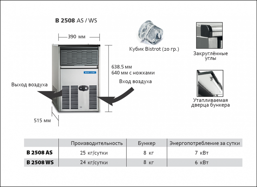 Льдогенератор BAR LINE (SCOTSMAN) B 2508 AS используется для производства кубикового льда Bistrot в форме "наперстка" на предприятиях общественного питания и торговли. Корпус выполнен из нержавеющей стали с антикоррозионной стойкостью. Оборудование работает на хладагенте R134a.