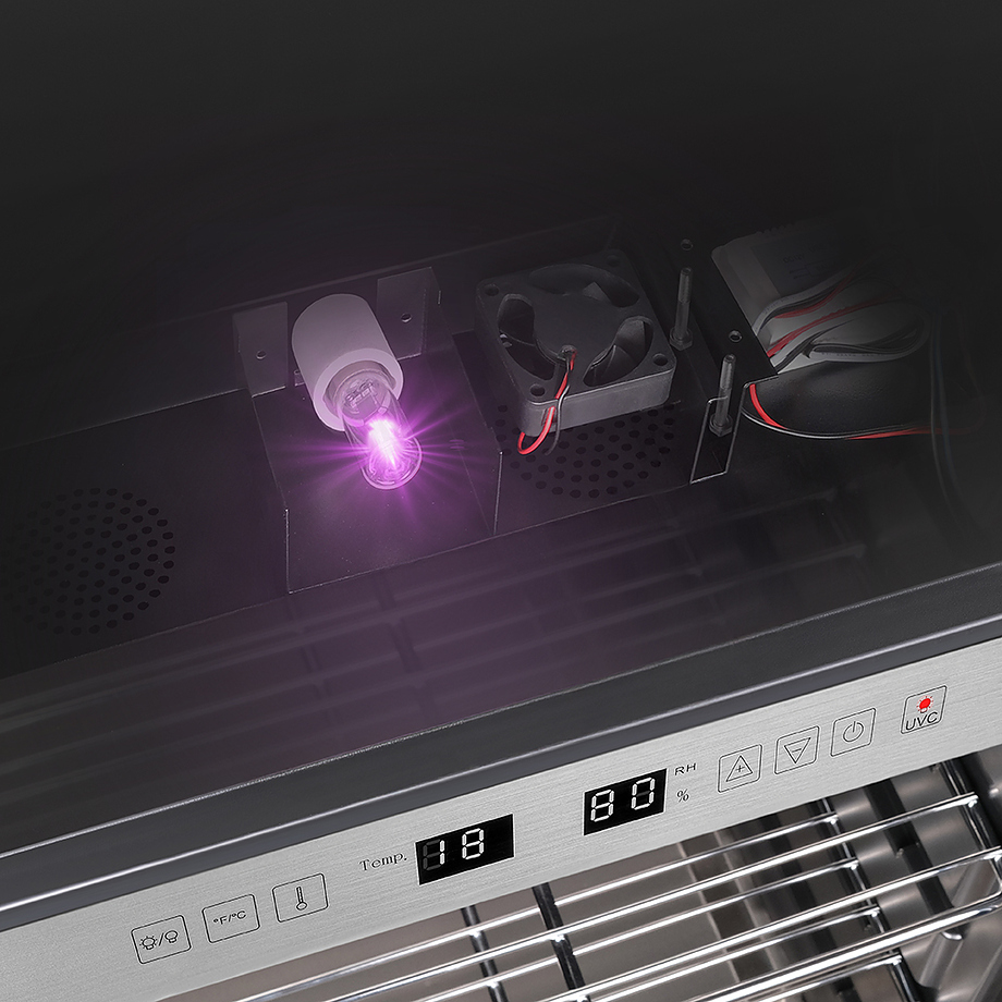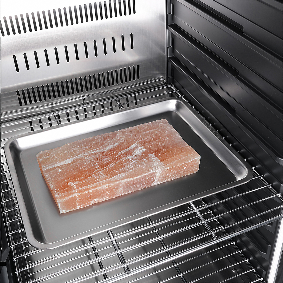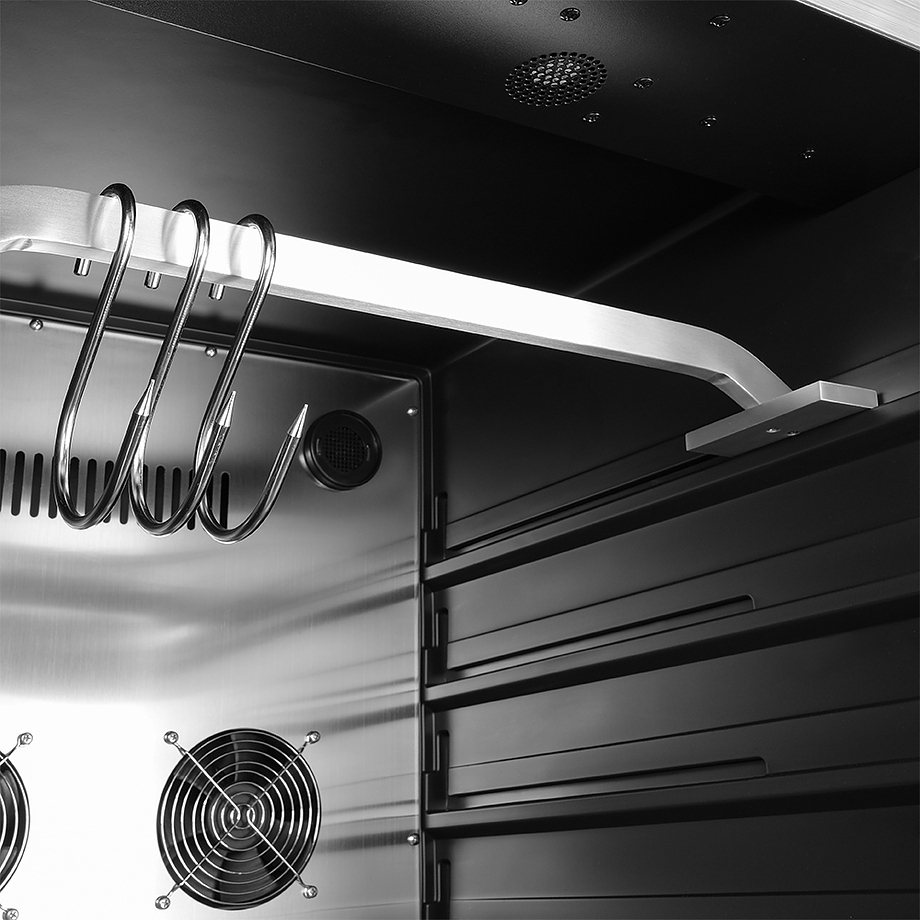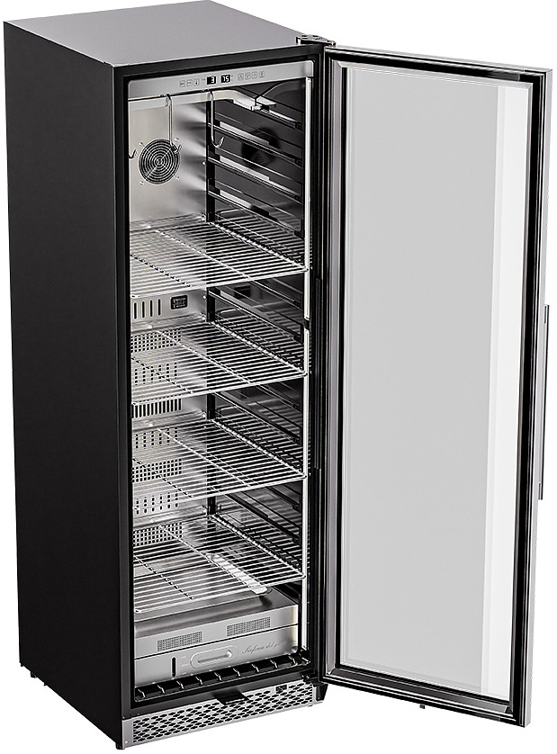 Шкаф Meyvel MM-135SR используется для охлаждения, хранения и вызревания мяса, птицы, колбасы, рыбы, ветчины, сыра и салями на предприятиях общественного питания, торговли, пищевых производствах и в домашних условиях. Модель оснащена сенсорным управлением, угольным фильтром, подсветкой, демонстрационным освещением, выдвижными полками, удобной ручкой, замком, поддоном для гималайской соли и регулируемыми по высоте ножками. Материал корпуса и ручки - сталь, материал рамки двери - бесшовная нержавеющая сталь, материал двери - тройное стекло с УФ фильтром, материал полок-решеток - хромированный металл.
