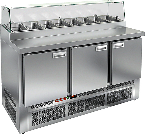 Охлаждаемый стол HICOLD PZE2-111/GN используется на предприятиях общественного питания, торговли и пищевых производствах для кратковременного хранения продуктов питания и напитков, раскатки теста и обработки ингредиентов перед приготовлением пиццы. Модель оснащена распашными дверцами, электронной панелью управления, автоматической оттайкой и регулируемыми ножками. Материал корпуса и столешницы - высококачественная нержавеющая сталь.