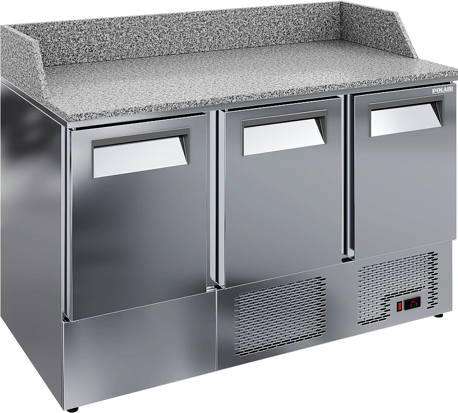 Холодильный стол для пиццы POLAIR TMi3GNpizza-GC серии Grande используется на предприятиях общественного питания, торговли и пищевых производствах для раскатки теста, хранения и обработки ингредиентов перед приготовлением пиццы. Данная модель обеспечивает механическую прочность, термоизоляцию и герметичность. Материал внешнего и внутреннего корпуса и дверей - высококачественная нержавеющая сталь, материал столешницы и борта - натуральный гранит, материал теплоизоляции - пенополиуретан, материал полок - крашенная оцинкованная проволока.