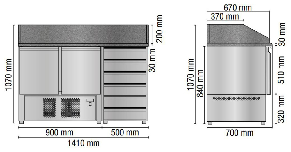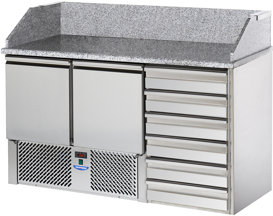 Стол для пиццы Tecnodom SLV02C6 используется на предприятиях общественного питания, торговли и пищевых производствах для раскатки теста и обработки ингредиентов перед приготовлением пиццы, а также для охлаждения и кратковременного хранения различных блюд, напитков и продуктов. Данная модель оснащена электронным управлением, NTC датчиком, динамическим охлаждением, автоматической оттайкой, испарителем с антикоррозионной обработкой и самозакрывающимися дверьми с магнитным уплотнителем. Материал корпуса - высококачественная нержавеющая сталь, материал рабочей поверхности - гранит, материал теплоизоляции - полиуретан, материал контейнеров - полипропилен.