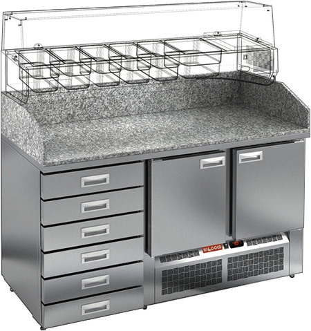 Стол для пиццы HICOLD PZE4-11/GN используется на предприятиях общественного питания, торговли и пищевых производствах для раскатки теста и обработки ингредиентов, используемых для приготовления пиццы, салатов и других блюд, а также для охлаждения и кратковременного хранения скоропортящихся продуктов и напитков. Модель совмещает в себе рабочую поверхность и охлаждаемый объем, что значительно упрощает работу повара, так как все необходимые компоненты всегда находятся под рукой. Материал корпуса - нержавеющая сталь, материал столешницы - гранит.