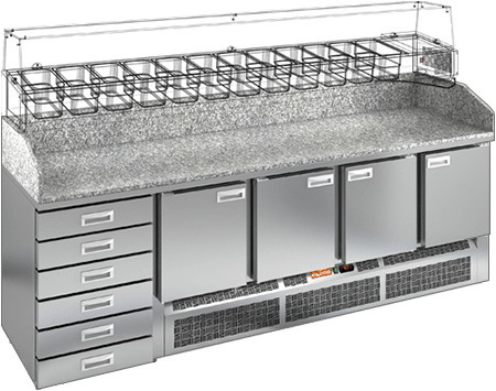 Стол для пиццы HICOLD PZE4-1111/GN используется на предприятиях общественного питания, торговли и пищевых производствах для раскатки теста и обработки ингредиентов, используемых для приготовления пиццы, салатов и других блюд, а также для охлаждения и кратковременного хранения скоропортящихся продуктов и напитков. Модель совмещает в себе рабочую поверхность и охлаждаемый объем, что значительно упрощает работу повара, так как все необходимые компоненты всегда находятся под рукой. Материал корпуса - нержавеющая сталь, материал столешницы - гранит.