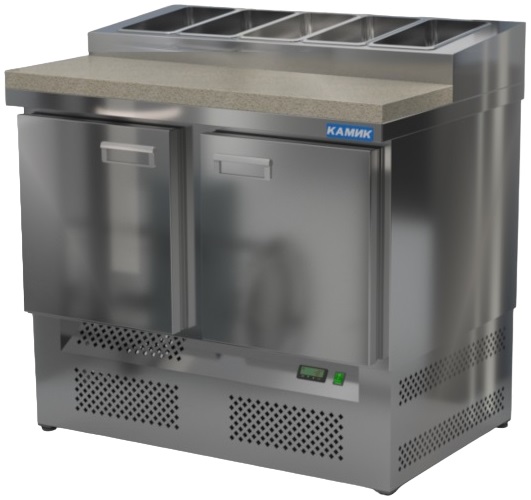 Холодильный стол КАМИК СОП-201076КН используется на предприятиях общественного питания и торговли для охлаждения и хранения продуктов, напитков и готовых блюд, а также для раскатки теста и обработки ингредиентов для приготовления пиццы. Конструкция разделена на секции, каждая из которых оборудована сетчатой полкой и парой направляющих. Корпус выполнен из нержавеющей стали AISI 430 толщиной 1 мм, столешница - из нержавеющей стали AISI 304 толщиной 1 мм.