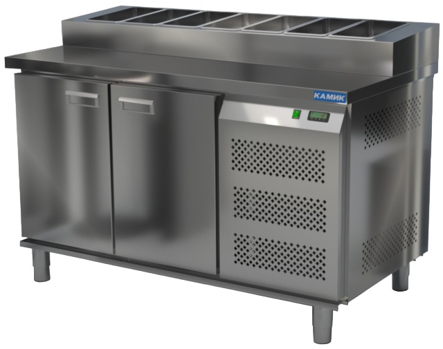 Холодильный стол КАМИК СОП-201473 используется на предприятиях общественного питания и торговли для охлаждения и хранения продуктов, напитков и готовых блюд, а также для раскатки теста и обработки ингредиентов для приготовления пиццы. Конструкция разделена на секции, каждая из которых оборудована сетчатой полкой и парой направляющих. Корпус выполнен из нержавеющей стали AISI 430 толщиной 1 мм, столешница - из нержавеющей стали AISI 304 толщиной 1 мм.