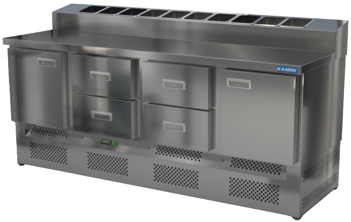 Холодильный стол КАМИК СОП-242076Н используется на предприятиях общественного питания и торговли для охлаждения и хранения продуктов, напитков и готовых блюд, а также для раскатки теста и обработки ингредиентов для приготовления пиццы. Конструкция разделена на секции, каждая из которых оборудована сетчатой полкой и парой направляющих. Корпус выполнен из нержавеющей стали AISI 430 толщиной 1 мм, столешница - из нержавеющей стали AISI 304 толщиной 1 мм.