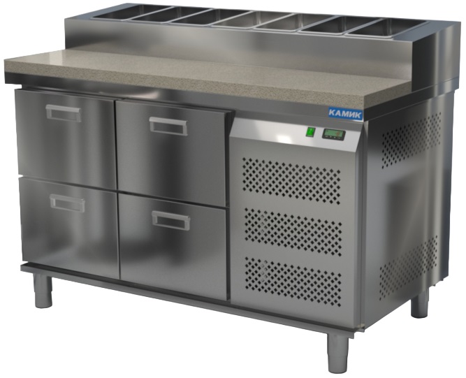 Холодильный стол КАМИК СОП-041473К используется на предприятиях общественного питания и торговли для охлаждения и хранения продуктов, напитков и готовых блюд, а также для раскатки теста и обработки ингредиентов для приготовления пиццы. Конструкция разделена на секции, каждая из которых оборудована сетчатой полкой и парой направляющих. Корпус выполнен из нержавеющей стали AISI 430 толщиной 1 мм, столешница - из нержавеющей стали AISI 304 толщиной 1 мм.
