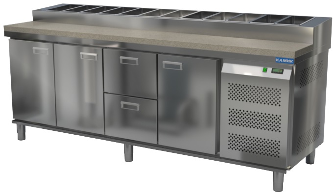 Холодильный стол КАМИК СОП-322373К используется на предприятиях общественного питания и торговли для охлаждения и хранения продуктов, напитков и готовых блюд, а также для раскатки теста и обработки ингредиентов для приготовления пиццы. Конструкция разделена на секции, каждая из которых оборудована сетчатой полкой и парой направляющих. Корпус выполнен из нержавеющей стали AISI 430 толщиной 1 мм, столешница - из нержавеющей стали AISI 304 толщиной 1 мм.