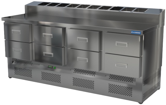 Холодильный стол КАМИК СОП-082073Н используется на предприятиях общественного питания и торговли для охлаждения и хранения продуктов, напитков и готовых блюд, а также для раскатки теста и обработки ингредиентов для приготовления пиццы. Конструкция разделена на секции, каждая из которых оборудована сетчатой полкой и парой направляющих. Корпус выполнен из нержавеющей стали AISI 430 толщиной 1 мм, столешница - из нержавеющей стали AISI 304 толщиной 1 мм.