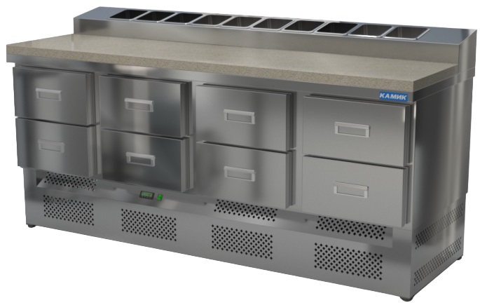 Холодильный стол КАМИК СОП-082076КН используется на предприятиях общественного питания и торговли для охлаждения и хранения продуктов, напитков и готовых блюд, а также для раскатки теста и обработки ингредиентов для приготовления пиццы. Конструкция разделена на секции, каждая из которых оборудована сетчатой полкой и парой направляющих. Корпус выполнен из нержавеющей стали AISI 430 толщиной 1 мм, столешница - из нержавеющей стали AISI 304 толщиной 1 мм.