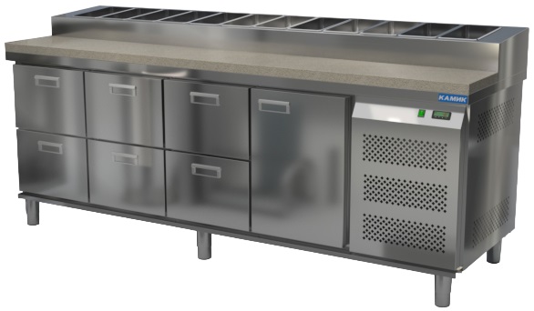 Холодильный стол КАМИК СОП-162376К используется на предприятиях общественного питания и торговли для охлаждения и хранения продуктов, напитков и готовых блюд, а также для раскатки теста и обработки ингредиентов для приготовления пиццы. Конструкция разделена на секции, каждая из которых оборудована сетчатой полкой и парой направляющих. Корпус выполнен из нержавеющей стали AISI 430 толщиной 1 мм, столешница - из нержавеющей стали AISI 304 толщиной 1 мм.