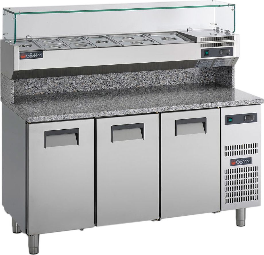 Холодильный стол Gemm SMR/16 серии NEW SMART предназначен для раскатки теста, обработки ингредиентов для приготовления пиццы, охлаждения и кратковременного хранения скоропортящихся продуктов и напитков на предприятиях общественного питания и торговли. Модель оснащена охлаждаемой витриной для контейнеров на гранитном бортике со стеклянной крышкой и цифровым термостатом. Столешница выполнена из сардинского гранита.