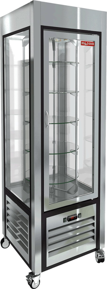 Кондитерская витрина HICOLD VRC 350 R FR используется на предприятиях общественного питания и торговли для демонстрации, охлаждения и кратковременного хранения кондитерских изделий и десертов. Модель оснащена 5 вращающимися полками, светодиодной подсветкой и колесами со стопорами. Корпус выполнен из нержавеющей стали.