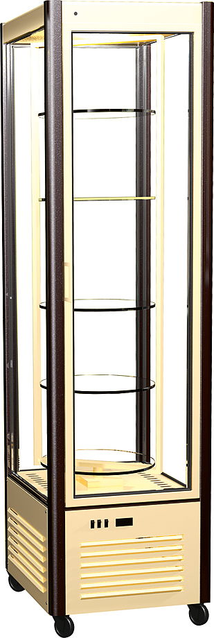 Кондитерская витрина Carboma R400Cвр используется на предприятиях общественного питания и торговли для демонстрации, охлаждения и кратковременного хранения тортов, пирожных и других кондитерских изделий. Модель оснащена 4-х сторонним остеклением, 4 крутящимися полками, которые можно устанавливать на разные уровни, и регулируемыми колесами высотой 100 мм.