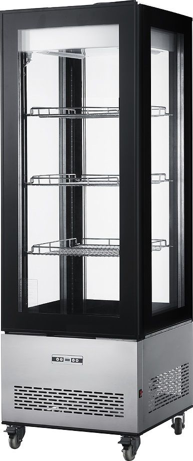 Холодильная витрина Enigma RT-400L предназначена для демонстрации, кратковременного хранения и охлаждения упакованных свежих продуктов, кондитерских изделий и десертов на предприятиях общественного питания и торговли. Модель оснащена электронным управлением с дисплеем и распашной дверью. База выполнена из нержавеющей стали, корпус выкрашен в черный цвет.