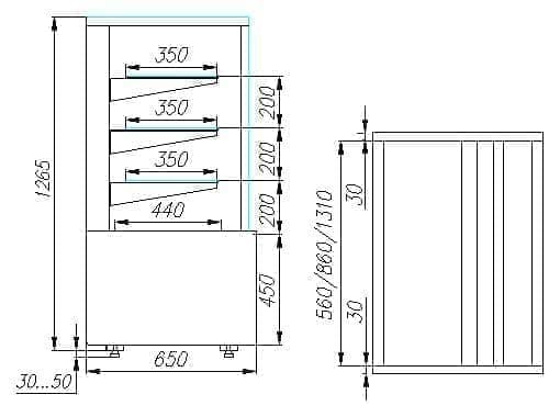 Нейтральная витрина Carboma KC70 N 1,3-1 Light Техно используется на предприятиях общественного питания и торговли для демонстрации и кратковременного хранения продукции, не требующей определенного температурного режима. Модель оснащена 4-х сторонним остеклением, 3 стеклянными полками и регулируемыми ножками высотой от 30 до 50 мм. Корпус выполнен из окрашенной стали с ППУ-изоляцией, раздвижные задние створки - из оргстекла.