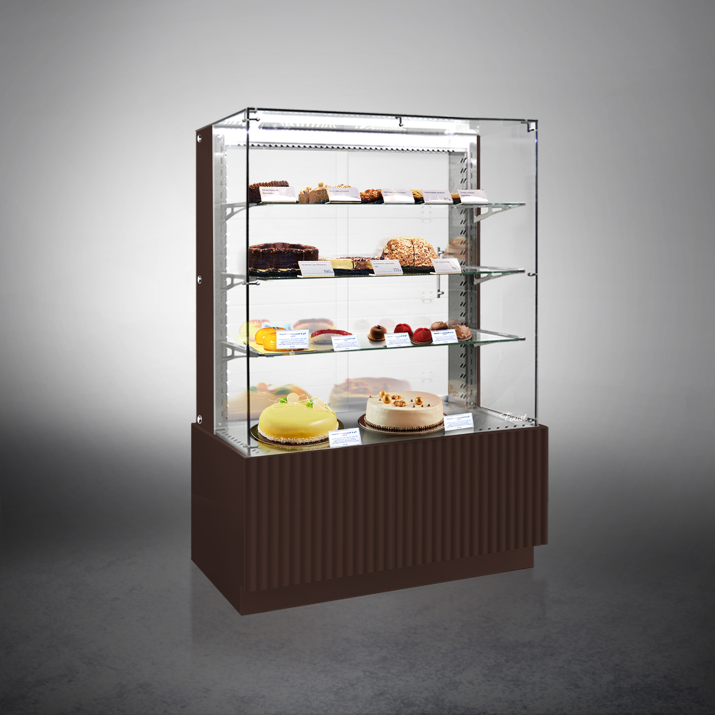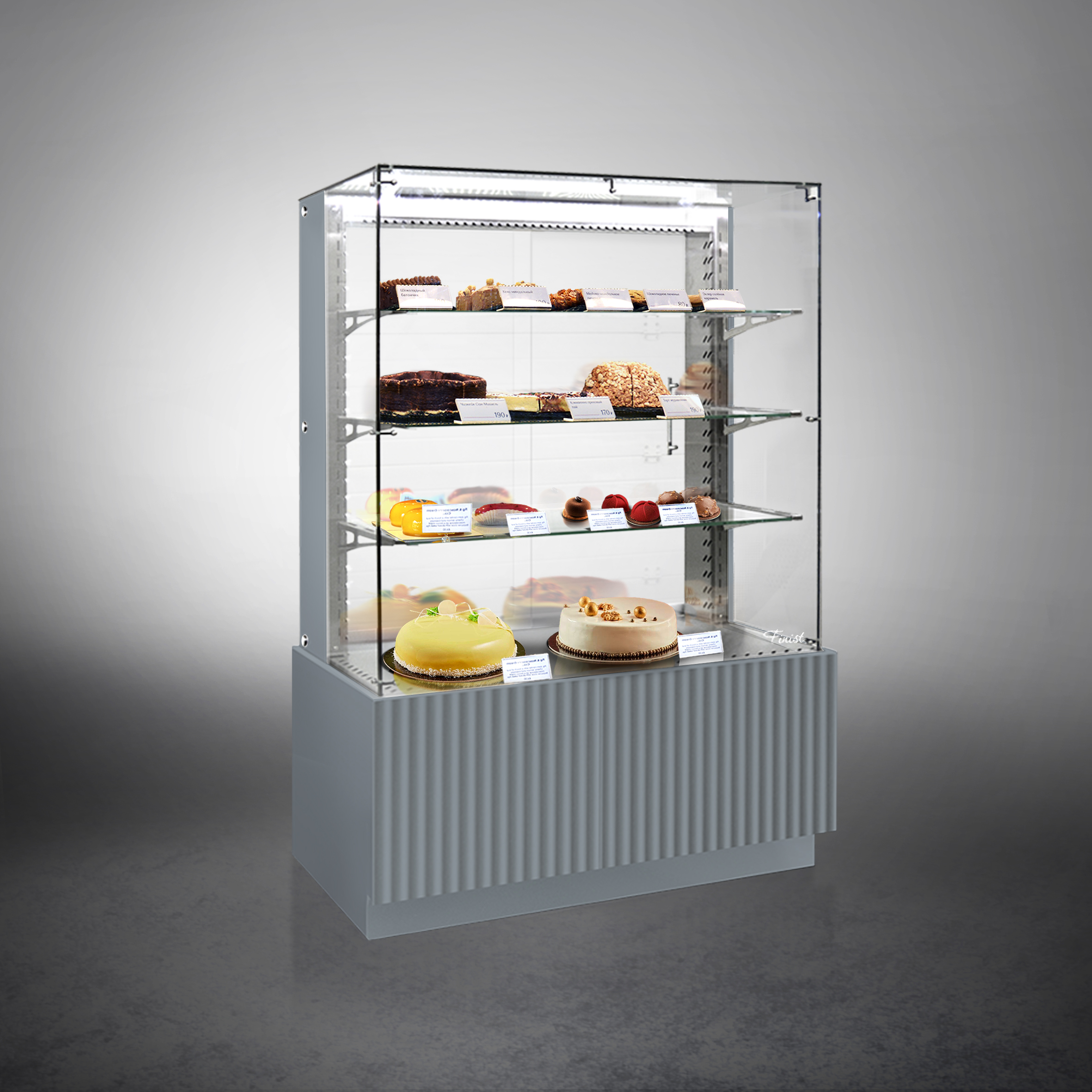Холодильная витрина Finist AIR LUX AL-13-7-163 используется для демонстрационной выкладки, охлаждения и хранения кондитерских и хлебобулочных изделий на предприятиях общественного питания и торговли. Модель оснащена микропроцессорным блоком, автоматической оттайкой, светодиодной подсветкой каждой полки, 3 стеклянными полками и удобными дверцами купе. Материал фронтальных и боковых панелей облицовки - МДФ панели, материал купола и полок - просветленное стекло, материал дна - зеркальная нержавеющая сталь.