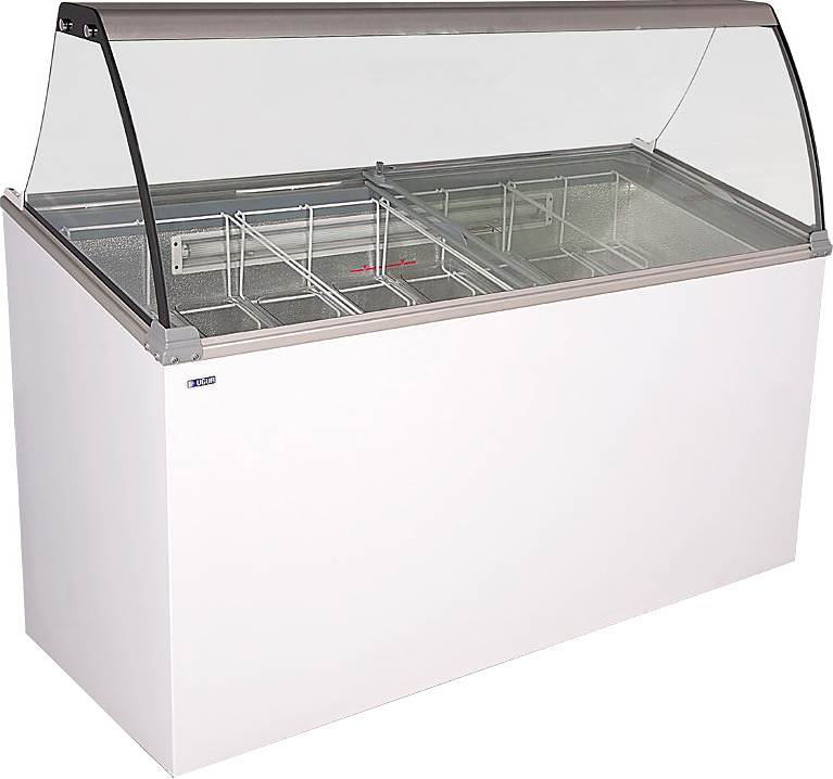 Витрина для мороженого UGUR UDR 14 SCE используется на предприятиях общественного питания, торговли и пищевых производствах для демонстрации, заморозки и долгосрочного хранения мягкого мороженого. Система статического охлаждения, цифровой термометр и раздвижные створки из закаленного стекла. Витрина установлена на колесиках с тормозом.