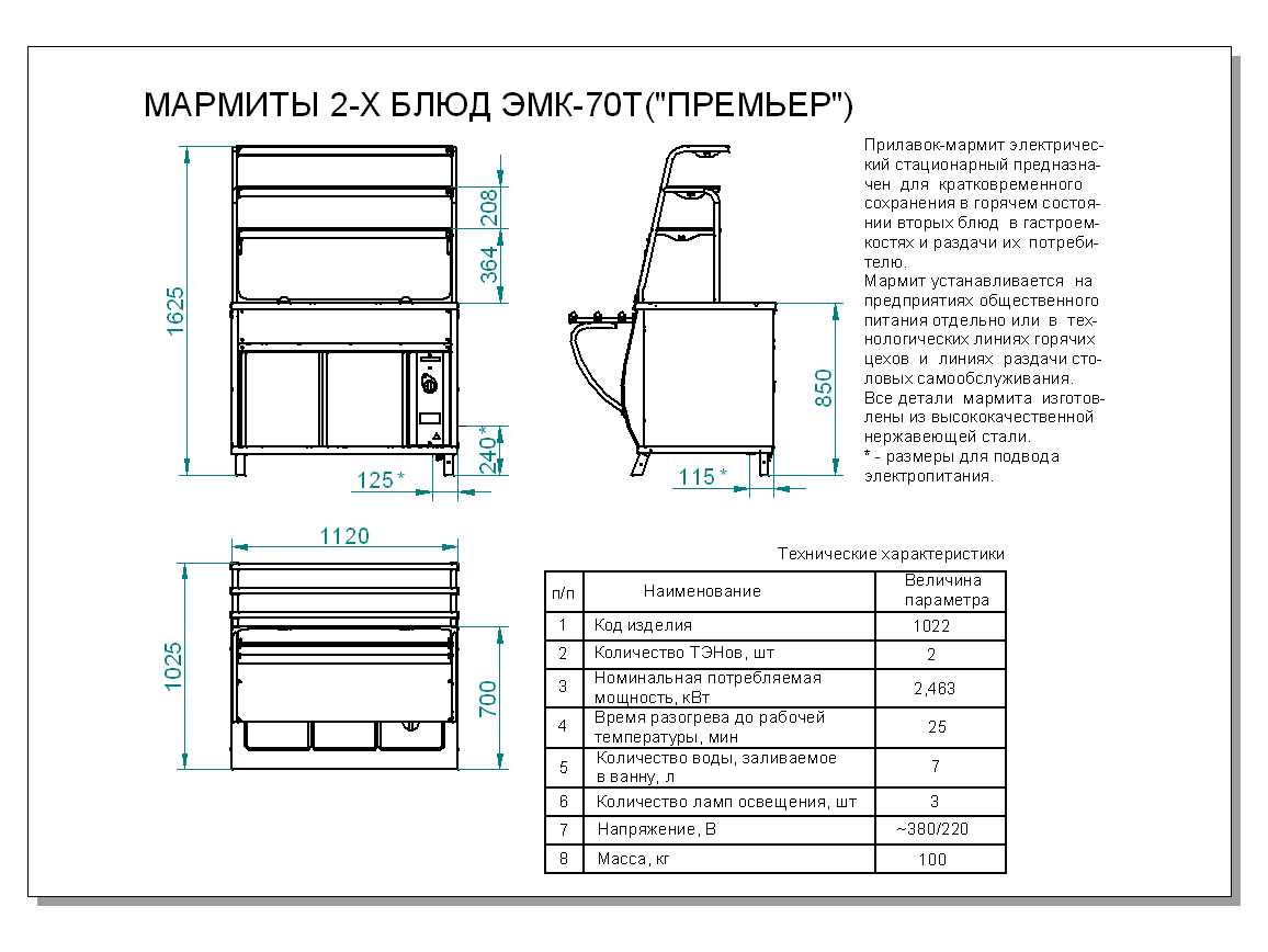 - Температура воздуха в ванне мармита: 85 °С