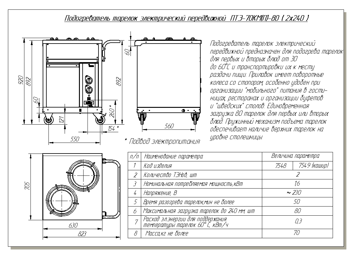 Прилавок для подогрева тарелок Abat ПТЭ-70КМ(П)-80 предназначен для подготовки посуды к последующему использованию и поддержания в теплом состоянии в составе линий раздач на предприятиях общественного питания и торговли. Модель оснащена пружинным механизмом кассетницы, которая производит автоматический подъем тарелок по мере их использования и регулируемыми по высоте ножками.