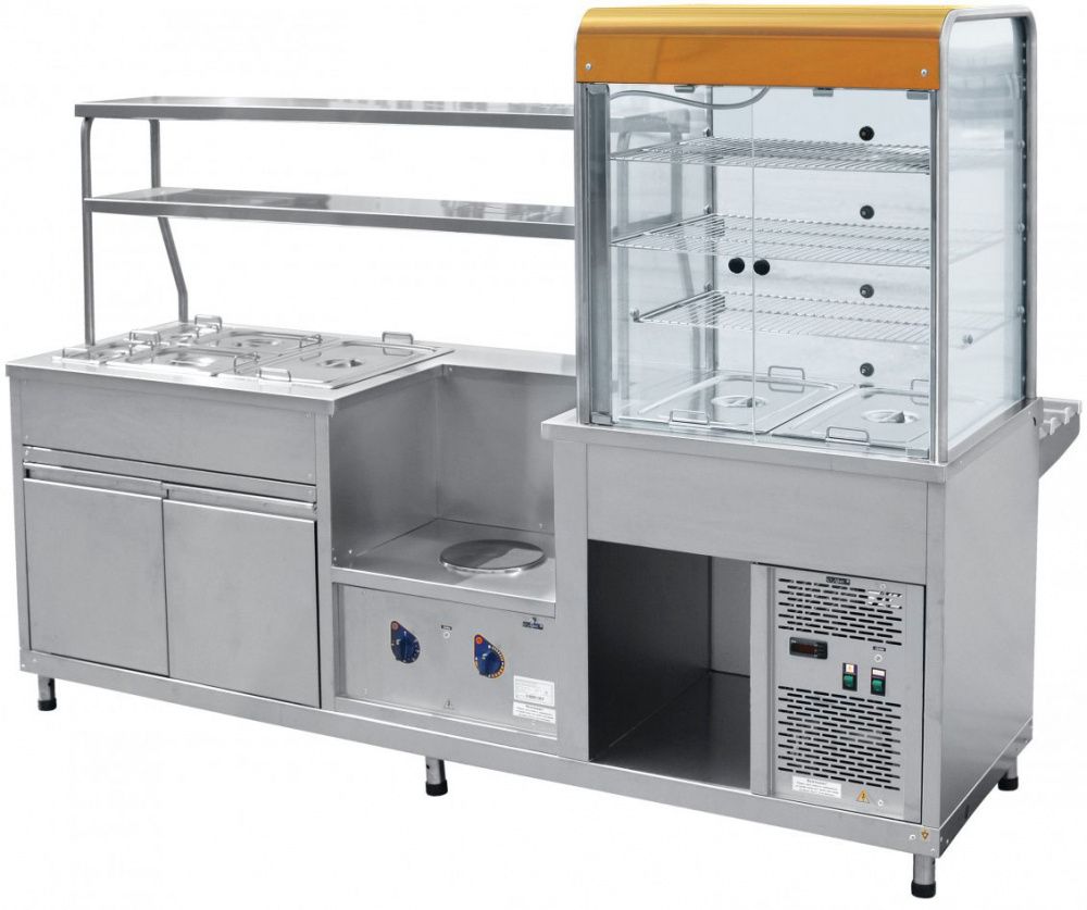 Прилавок-витрина Abat ПВХМ-70КМУ предназначен для демонстрации, охлаждения, кратковременного хранения и поддержания первых и вторых блюд в горячем состоянии в составе линий раздач на предприятиях общественного питания и торговли. Этому способствует наличие холодильной витрины и мармитного отдела для первых и вторых блюд. Модель оснащена регулируемыми по высоте ножками.