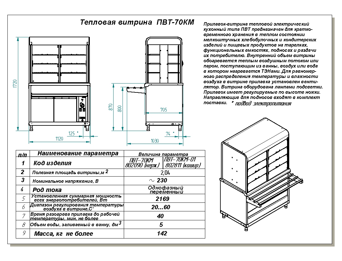 Прилавок-витрина Abat ПВТ-70КМ предназначен для демонстрации, кратковременного хранения и поддержания в теплом состоянии блюд и закусок в составе линий раздач на предприятиях общественного питания и торговли. Модель оснащена регулируемыми по высоте ножками.