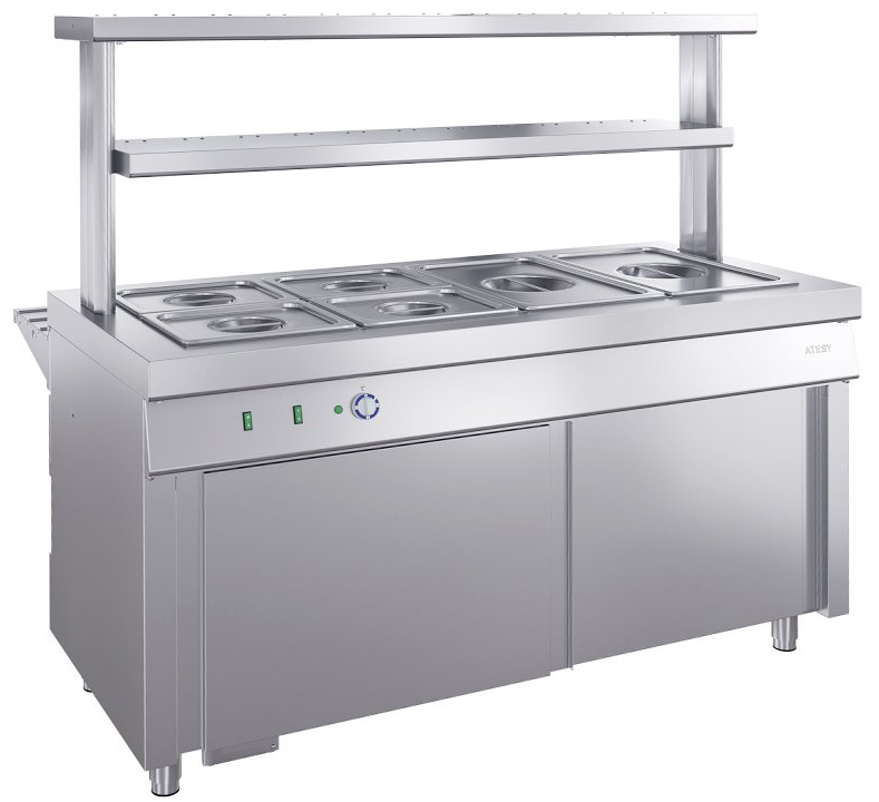 Мармит ATESY Ривьера М2-1500-02-СО используется на предприятиях общественного питания и торговли для поддержания в горячем состоянии гастроемкостей со вторыми блюдами, гарнирами и соусами. Модель оснащена герметичной ванной для размещения гастроемкостей и терморегулятором, позволяющим осуществлять настройку температуры нагрева гастроемкостей. Столешница выполнена из нержавеющей стали AISI 430 и усилена листом ламинированной ДСП толщиной 16 мм, ванна - из нержавеющей стали, ножки - из нержавеющей стали и пластиковой опорной части.