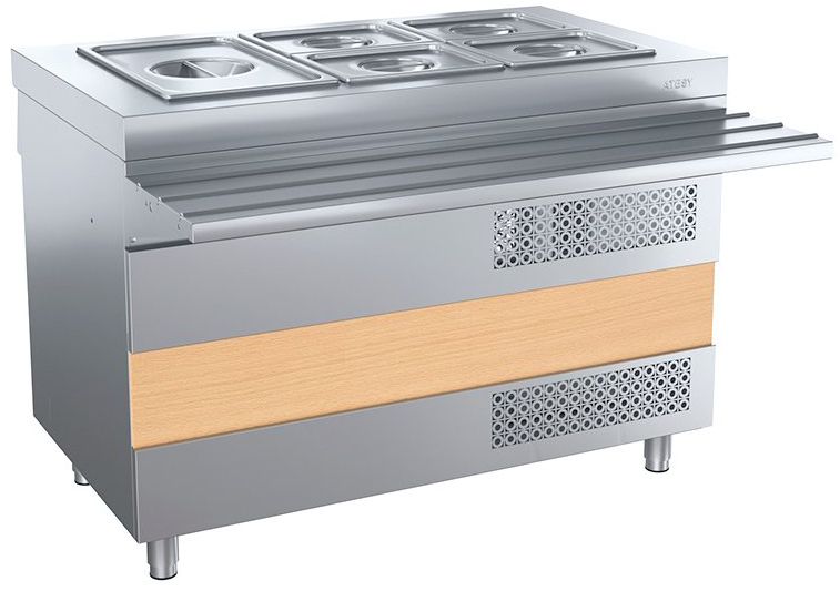 Охлаждаемый стол ATESY Ривьера ОС-1200-02-О используется на предприятиях общественного питания и торговли для кратковременного хранения и раздачи холодных напитков, салатов, кисломолочных продуктов и других блюд, требующих хранения в охлажденном состоянии. Модель оснащена герметичной ванной для размещения гастроемкостей или напитков и продуктов в фабричной упаковке, а также тарелок с уже сервированными блюдами непосредственно на дне ванны. Столешница выполнена из нержавеющей стали AISI 430 и усилена листом ламинированной ДСП толщиной 16 мм, ванна - из нержавеющей стали, ножки - из нержавеющей стали и пластиковой опорной части.